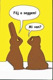 :D:D Holnap fizikadoga...de jó hír hogy föcin pl. filmet nézünk, a 6-7. óra elmarad (legalábbis nekem) :D Na még a holnapot bírjuk ki és aztán vahh:D Szünet!! Előre is kellemes húsvéti ünnepeket kívánok mindenkinek :D Ide most felteszek egy fájóan hülye képet. Nekem csak kb. 10 másodperc múlva esett le miért fáj a nyuszinak a feneke :P